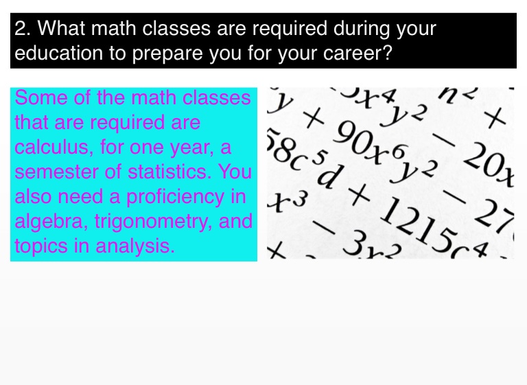 Some of the math classes that are required are calculus, for one year, a semester of statistics. You also need a proficiency in algebra, trigonometry, and topics in analysis.