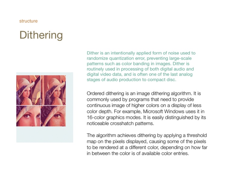 Dither is an intentionally applied form of noise used to randomize quantization error, preventing large-scale patterns such as color banding in images. Dither is routinely used in processing of both digital audio and digital video data, and is often one of the last analog stages of audio production to compact disc.