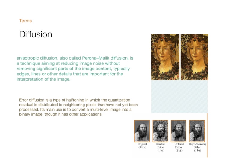 anisotropic diffusion, also called Perona–Malik diffusion, is a technique aiming at reducing image noise without removing significant parts of the image content, typically edges, lines or other details that are important for the interpretation of the image.