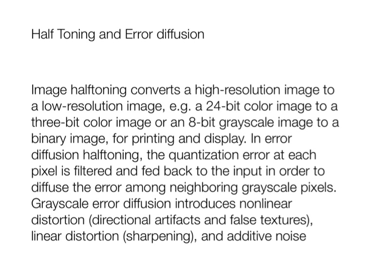 Image halftoning converts a high-resolution image to a low-resolution image, e.g. a 24-bit color image to a three-bit color image or an 8-bit grayscale image to a binary image, for printing and display. In error diffusion halftoning, the quantization error at each pixel is filtered and fed back to the input in order to diffuse the error among neighboring grayscale pixels. Grayscale error diffusion introduces nonlinear distortion (directional artifacts and false textures), linear distortion (sharpening), and additive noise