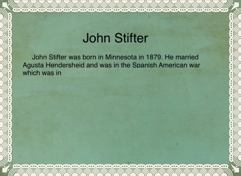 John Stifter was born in Minnesota in 1879. He married Agusta Hendersheid and was in the Spanish American war which was in 1898. "On April 25, 1898 the United States declared war on Spain following the sinking of the Battleship Maine in Havana harbor on February 15, 1898. The war ended with the signing of the Treaty of Paris on December 10, 1898. As a result Spain lost its control over the remains of its overseas empire -- Cuba, Puerto Rico, the Philippines Islands, Guam, and other islands."-Loc.gov