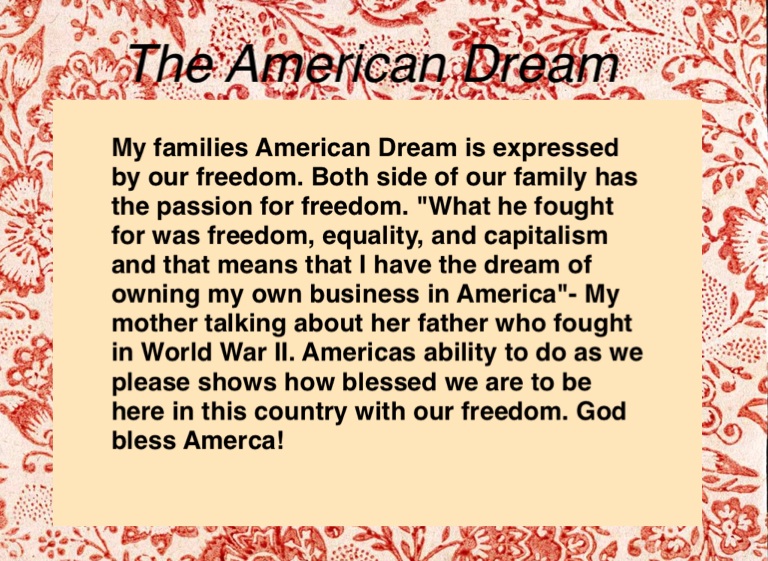 My families American Dream is expressed by our freedom. Both side of our family has the passion for freedom. "What he fought for was freedom, equality, and capitalism and that means that I have the dream of owning my own business in America"- My mother talking about her father who fought in World War II. Americas ability to do as we please shows how blessed we are to be here in this country with our freedom. God bless Amerca!