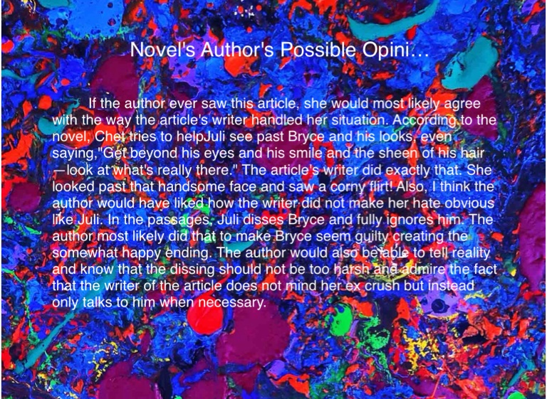 If the author ever saw this article, she would most likely agree with the way the article's writer handled her situation. According to the novel, Chet tries to helpJuli see past Bryce and his looks, even saying,"Get beyond his eyes and his smile and the sheen of his hair—look at what's really there." The article's writer did exactly that. She looked past that handsome face and saw a corny flirt! Also, I think the author would have liked how the writer did not make her hate obvious like Juli. In the passages, Juli disses Bryce and fully ignores him. The author most likely did that to make Bryce seem guilty creating the somewhat happy ending. The author would also be able to tell reality and know that the dissing should not be too harsh and admire the fact that the writer of the article does not mind her ex crush but instead only talks to him when necessary.