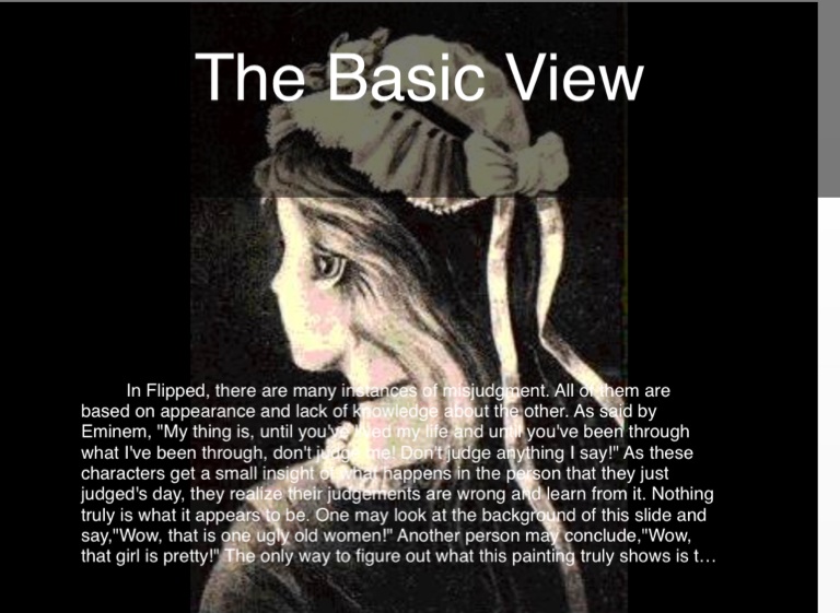 In Flipped, there are many instances of misjudgment. All of them are based on appearance and lack of knowledge about the other. As said by Eminem, "My thing is, until you've lived my life and until you've been through what I've been through, don't judge me! Don't judge anything I say!" As these characters get a small insight of what happens in the person that they just judged's day, they realize their judgements are wrong and learn from it. Nothing truly is what it appears to be. One may look at the background of this slide and say,"Wow, that is one ugly old women!" Another person may conclude,"Wow, that girl is pretty!" The only way to figure out what this painting truly shows is to ask the artist instead of immediately judging it's a girl or an elder.