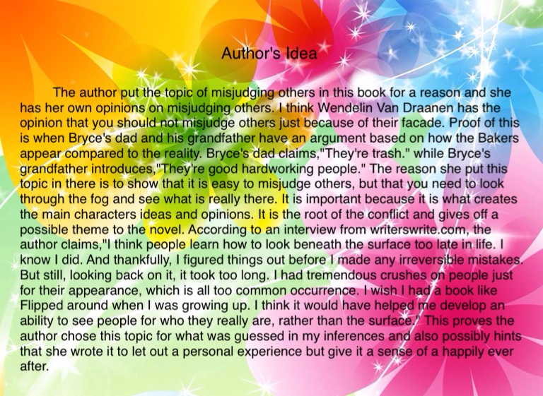 The author put the topic of misjudging others in this book for a reason and she has her own opinions on misjudging others. I think Wendelin Van Draanen has the opinion that you should not misjudge others just because of their facade. Proof of this is when Bryce's dad and his grandfather have an argument based on how the Bakers appear compared to the reality. Bryce's dad claims,"They're trash." while Bryce's grandfather introduces,"They're good hardworking people." The reason she put this topic in there is to show that it is easy to misjudge others, but that you need to look through the fog and see what is really there. It is important because it is what creates the main characters ideas and opinions. It is the root of the conflict and gives off a possible theme to the novel. According to an interview from writerswrite.com, the author claims,"I think people learn how to look beneath the surface too late in life. I know I did. And thankfully, I figured things out before I made any irreversible mistakes. But still, looking back on it, it took too long. I had tremendous crushes on people just for their appearance, which is all too common occurrence. I wish I had a book like Flipped around when I was growing up. I think it would have helped me develop an ability to see people for who they really are, rather than the surface." This proves the author chose this topic for what was guessed in my inferences and also possibly hints that she wrote it to let out a personal experience but give it a sense of a happily ever after.
