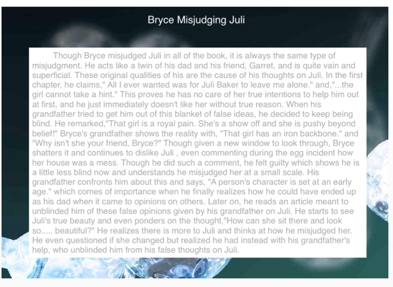Though Bryce misjudged Juli in all of the book, it is always the same type of misjudgment. He acts like a twin of his dad and his friend, Garret, and is quite vain and superficial. These original qualities of his are the cause of his thoughts on Juli. In the first chapter, he claims," All I ever wanted was for Juli Baker to leave me alone." and,"...the girl cannot take a hint." This proves he has no care of her true intentions to help him out at first, and he just immediately doesn't like her without true reason. When his grandfather tried to get him out of this blanket of false ideas, he decided to keep being blind. He remarked,"That girl is a royal pain. She's a show off and she is pushy beyond belief!" Bryce's grandfather shows the reality with, "That girl has an iron backbone." and "Why isn't she your friend, Bryce?" Though given a new window to look through, Bryce shatters it and continues to dislike Juli , even commenting during the egg incident how her house was a mess. Though he did such a comment, he felt guilty which shows he is a little less blind now and understands he misjudged her at a small scale. His grandfather confronts him about this and says, "A person's character is set at an early age." which comes of importance when he finally realizes how he could have ended up as his dad when it came to opinions on others. Later on, he reads an article meant to unblinded him of these false opinions given by his grandfather on Juli. He starts to see Juli's true beauty and even ponders on the thought,"How can she sit there and look so..... beautiful?" He realizes there is more to Juli and thinks at how he misjudged her. He even questioned if she changed but realized he had instead with his grandfather's help, who unblinded him from his false thoughts on Juli.