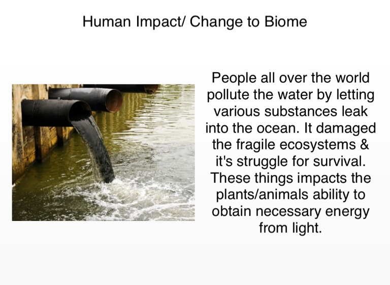 People all over the world pollute the water by letting various substances leak into the ocean. It damaged the fragile ecosystems & it's struggle for survival. These things impacts the plants/animals ability to obtain necessary energy from light.