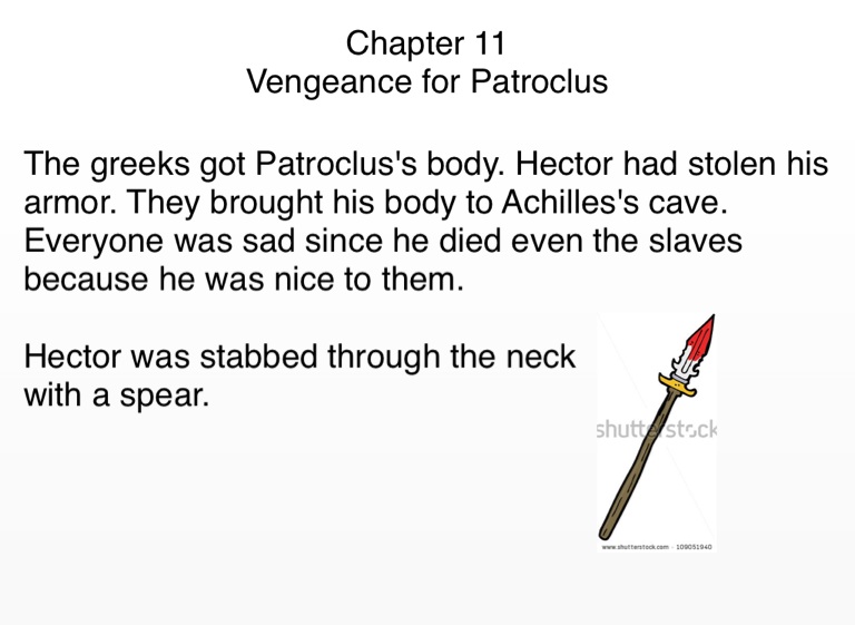 The greeks got Patroclus's body. Hector had stolen his armor. They brought his body to Achilles's cave. Everyone was sad since he died even the slaves because he was nice to them.