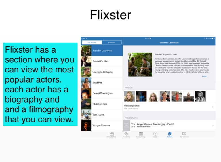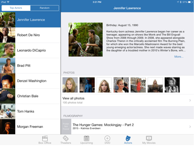 Flixster has a section where you can view the most popular actors. each actor has a biography and and a filmography that you can view.