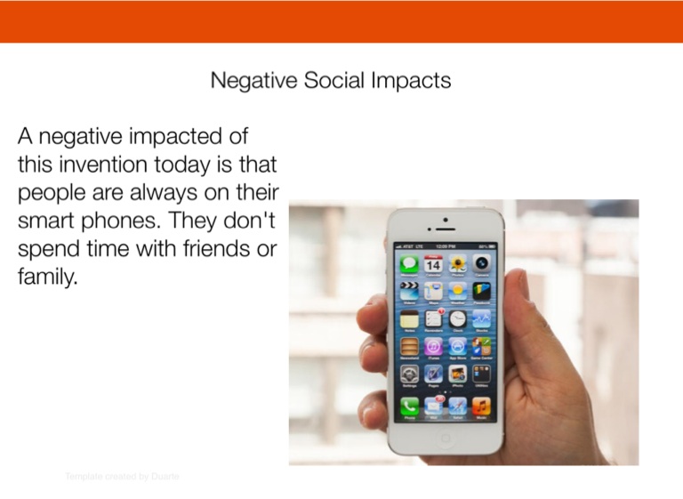 A negative impacted of this invention today is that people are always on their smart phones. They don't spend time with friends or family.