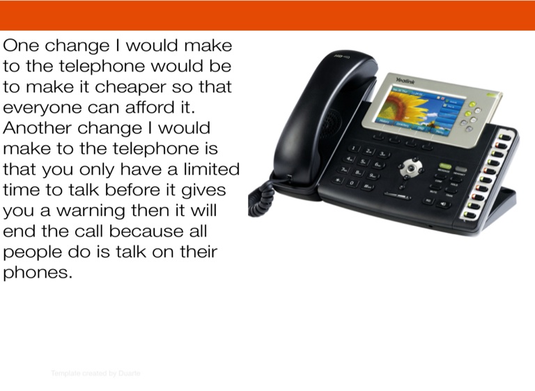 One change I would make to the telephone would be to make it cheaper so that everyone can afford it. Another change I would make to the telephone is that you only have a limited time to talk before it gives you a warning then it will end the call because all people do is talk on their phones.