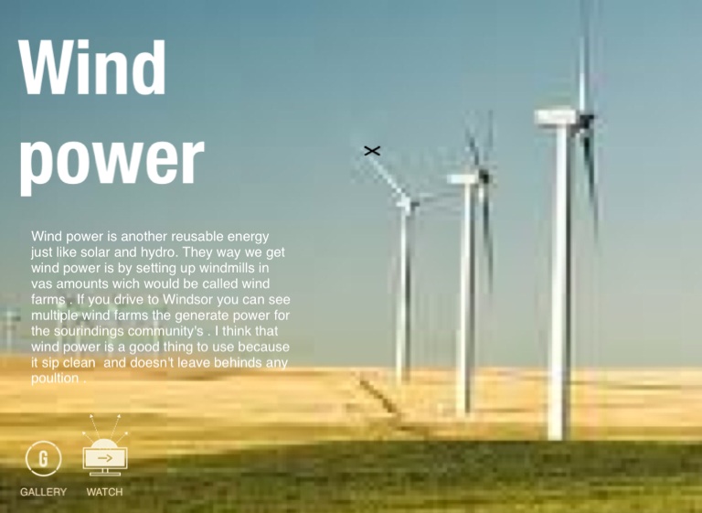 Wind power is another reusable energy just like solar and hydro. They way we get wind power is by setting up windmills in vas amounts wich would be called wind farms . If you drive to Windsor you can see multiple wind farms the generate power for the sourindings community's . I think that wind power is a good thing to use because it sip clean and doesn't leave behinds any poultion .