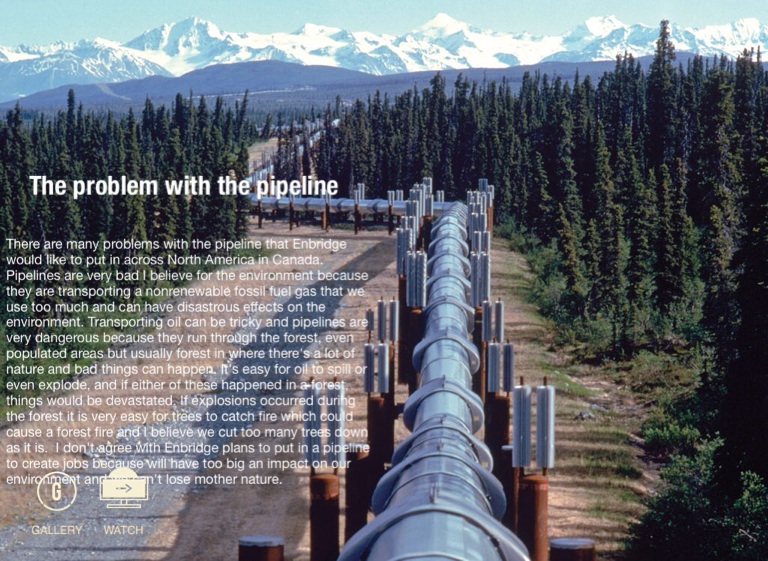 There are many problems with the pipeline that Enbridge would like to put in across North America in Canada. Pipelines are very bad I believe for the environment because they are transporting a nonrenewable fossil fuel gas that we use too much and can have disastrous effects on the environment. Transporting oil can be tricky and pipelines are very dangerous because they run through the forest, even populated areas but usually forest in where there's a lot of nature and bad things can happen. It's easy for oil to spill or even explode, and if either of these happened in a forest, things would be devastated. If explosions occurred during the forest it is very easy for trees to catch fire which could cause a forest fire and I believe we cut too many trees down as it is. I don't agree with Enbridge plans to put in a pipeline to create jobs because will have too big an impact on our environment and we can't lose mother nature.
