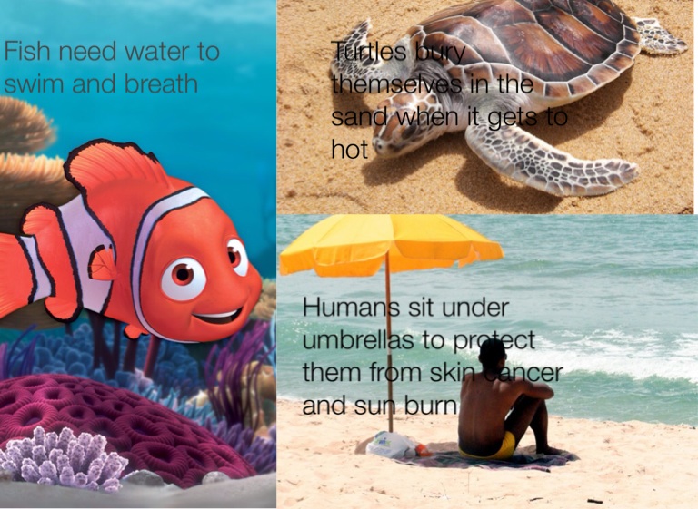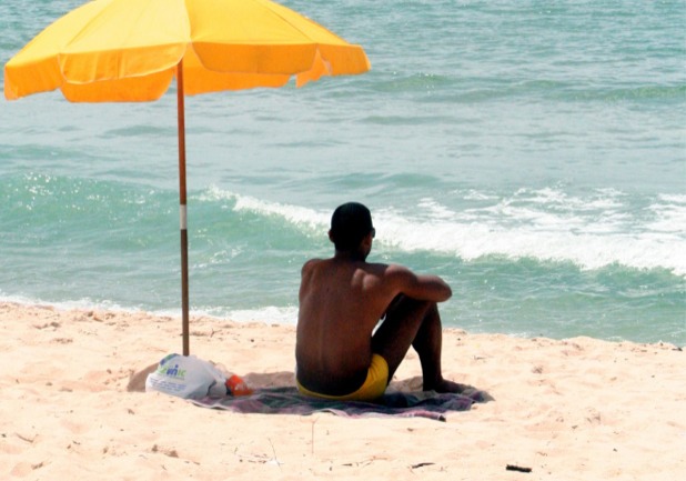 Humans sit under umbrellas to protect them from skin cancer and sun burn