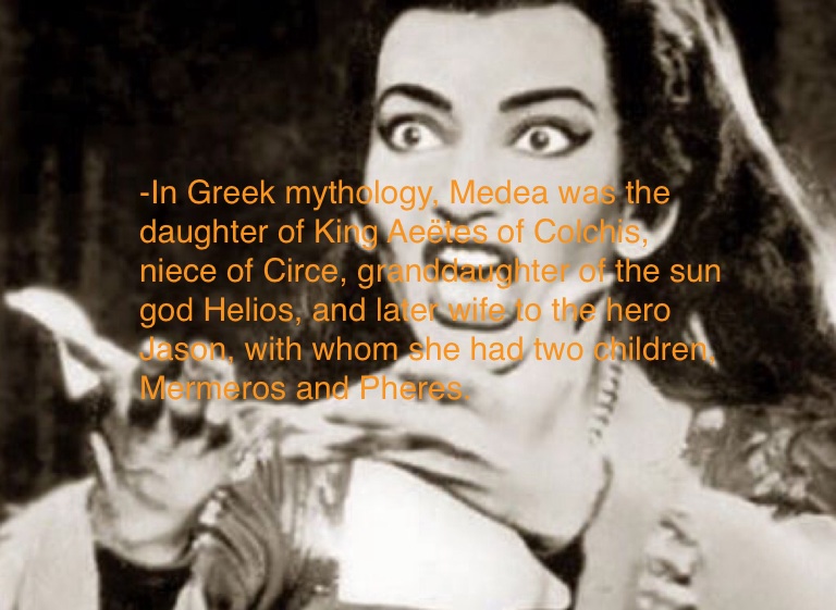 -In Greek mythology, Medea was the daughter of King Aeëtes of Colchis, niece of Circe, granddaughter of the sun god Helios, and later wife to the hero Jason, with whom she had two children, Mermeros and Pheres.