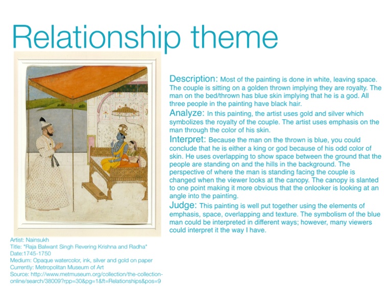 Description: Most of the painting is done in white, leaving space. The couple is sitting on a golden thrown implying they are royalty. The man on the bed/thrown has blue skin implying that he is a god. All three people in the painting have black hair.