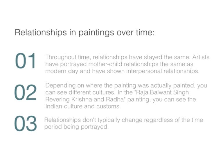 Throughout time, relationships have stayed the same. Artists have portrayed mother-child relationships the same as modern day and have shown interpersonal relationships.