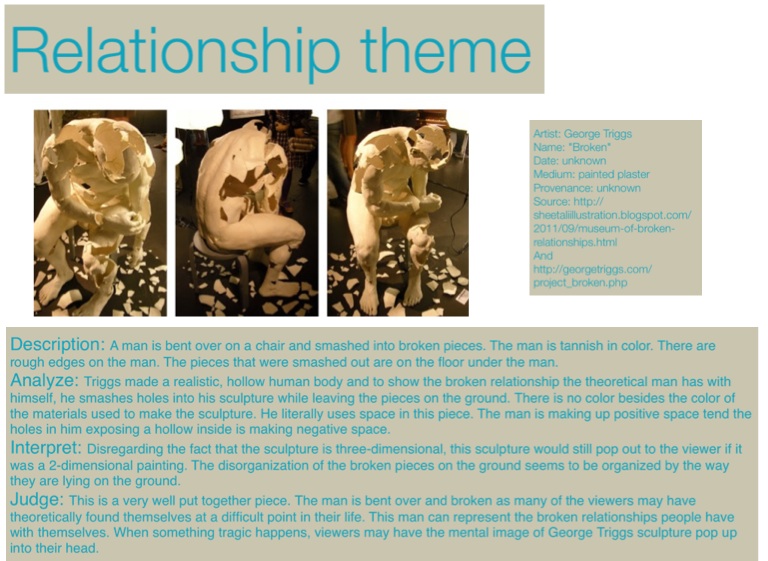 Analyze: Triggs made a realistic, hollow human body and to show the broken relationship the theoretical man has with himself, he smashes holes into his sculpture while leaving the pieces on the ground. There is no color besides the color of the materials used to make the sculpture. He literally uses space in this piece. The man is making up positive space tend the holes in him exposing a hollow inside is making negative space.