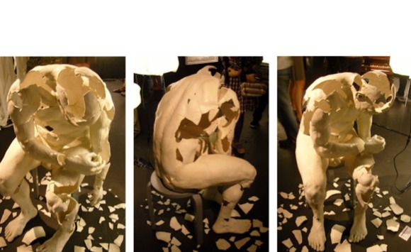 Description: A man is bent over on a chair and smashed into broken pieces. The man is tannish in color. There are rough edges on the man. The pieces that were smashed out are on the floor under the man.
