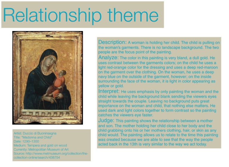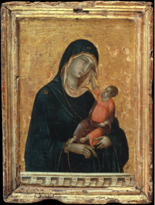 Judge: This painting shows the relationship between a mother and son. The mother holding her child close to her body and the child grabbing onto his or her mothers clothing, hair, or skin as any child would. The painting allows us to relate to the time this painting was created because we are able to see that the way the people acted back in the 13th is very similar to the way we act today.