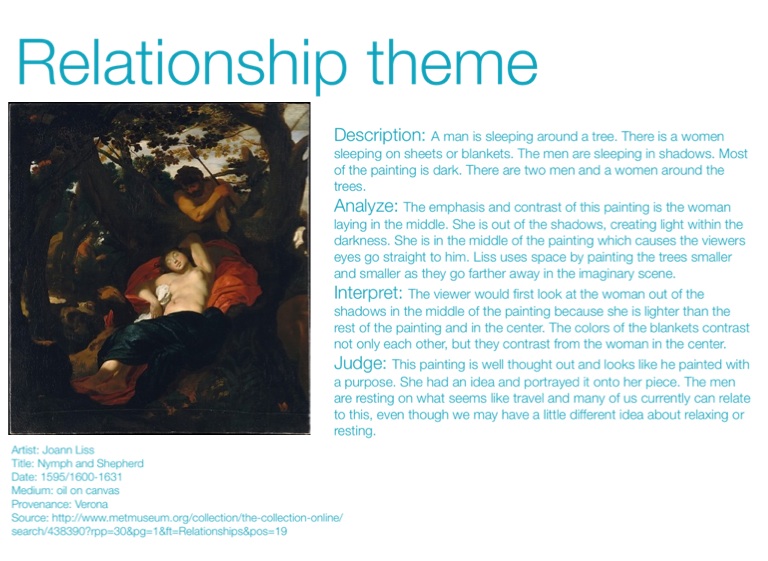 Analyze: The emphasis and contrast of this painting is the woman laying in the middle. She is out of the shadows, creating light within the darkness. She is in the middle of the painting which causes the viewers eyes go straight to him. Liss uses space by painting the trees smaller and smaller as they go farther away in the imaginary scene.