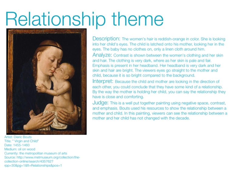Judge: This is a well put together painting using negative space, contrast, and emphasis. Bouts used his resources to show the relationship between a mother and child. In this painting, viewers can see the relationship between a mother and her child has not changed with the decade.