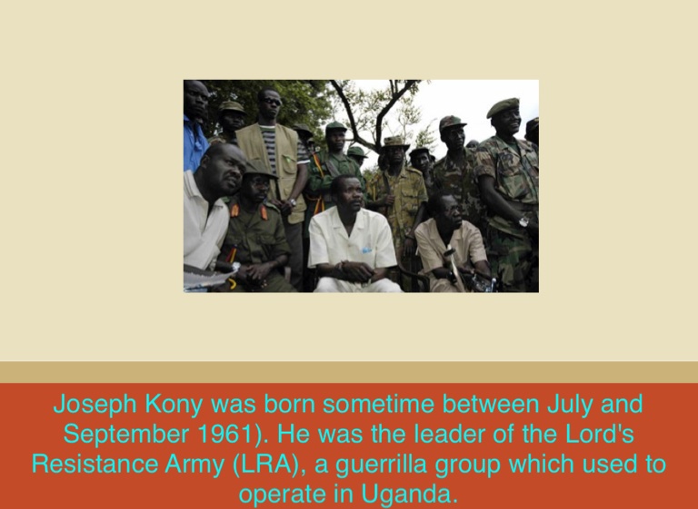 Joseph Kony was born sometime between July and September 1961). He was the leader of the Lord's Resistance Army (LRA), a guerrilla group which used to operate in Uganda.