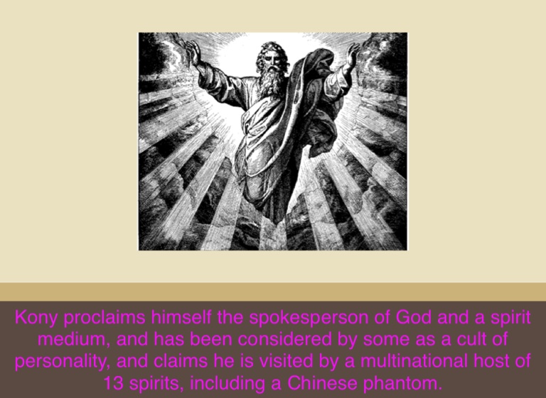 Kony proclaims himself the spokesperson of God and a spirit medium, and has been considered by some as a cult of personality, and claims he is visited by a multinational host of 13 spirits, including a Chinese phantom.