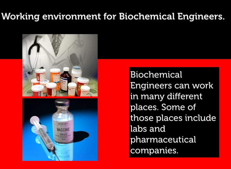 Biochemical Engineers can work in many different places. Some of those places include labs and pharmaceutical companies.