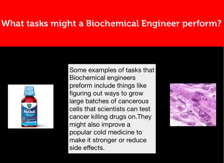 Some examples of tasks that Biochemical engineers preform include things like figuring out ways to grow large batches of cancerous cells that scientists can test cancer killing drugs on.They might also improve a popular cold medicine to make it stronger or reduce side effects.