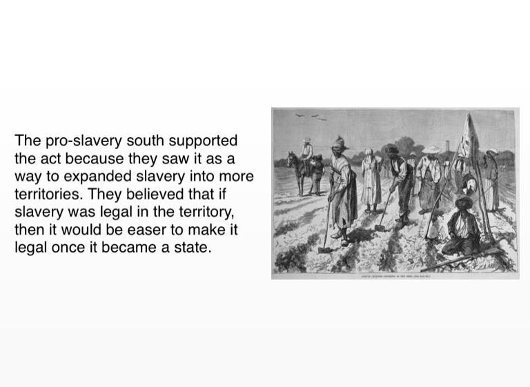 The pro-slavery south supported the act because they saw it as a way to expanded slavery into more territories. They believed that if slavery was legal in the territory, then it would be easer to make it legal once it became a state.