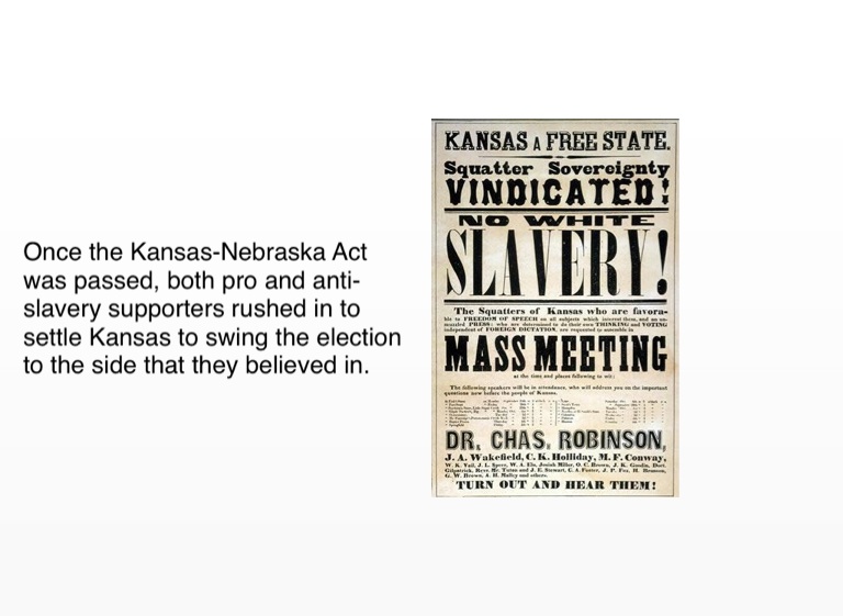 Once the Kansas-Nebraska Act was passed, both pro and anti-slavery supporters rushed in to settle Kansas to swing the election to the side that they believed in.