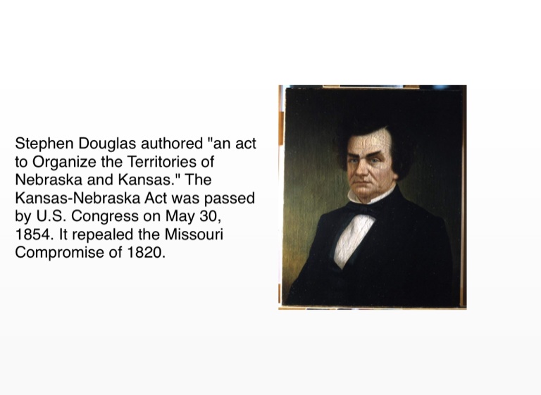 Stephen Douglas authored "an act to Organize the Territories of Nebraska and Kansas." The Kansas-Nebraska Act was passed by U.S. Congress on May 30, 1854. It repealed the Missouri Compromise of 1820.
