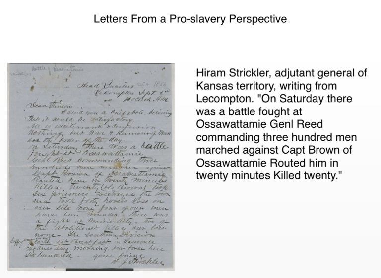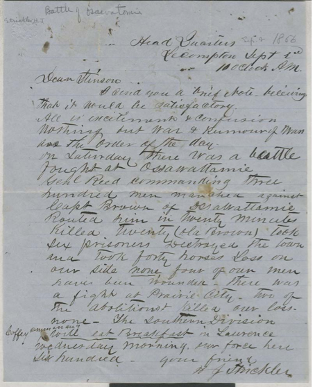 Hiram Strickler, adjutant general of Kansas territory, writing from Lecompton. "On Saturday there was a battle fought at Ossawattamie Genl Reed commanding three hundred men marched against Capt Brown of Ossawattamie Routed him in twenty minutes Killed twenty."