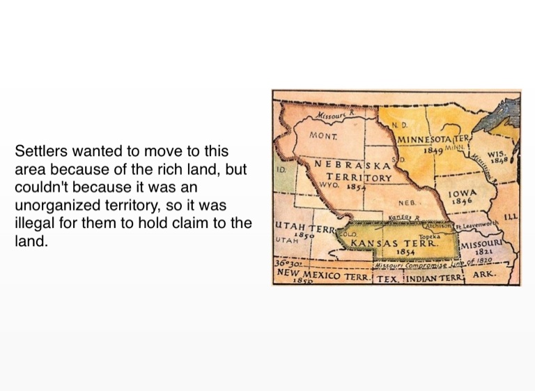 Settlers wanted to move to this area because of the rich land, but couldn't because it was an unorganized territory, so it was illegal for them to hold claim to the land.