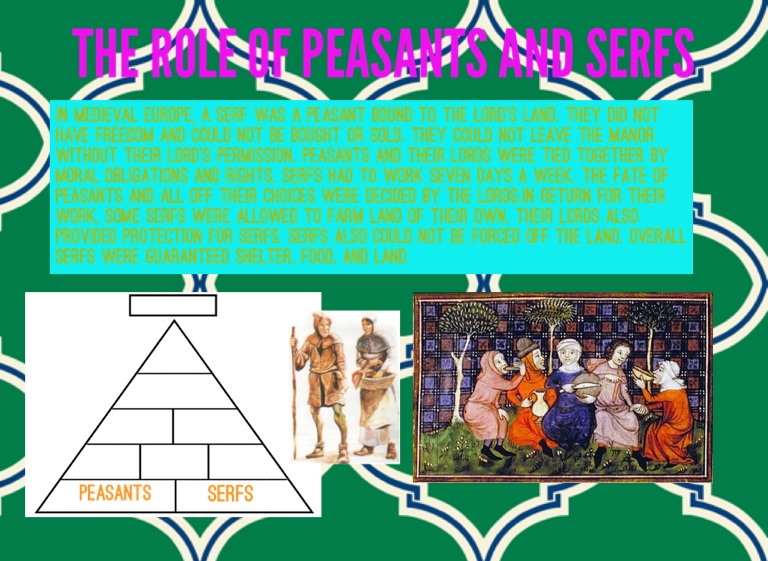 In medieval Europe, a serf was a peasant bound to the lord's land. They did not have freedom and could not be bought or sold. They could not leave the manor without their lord's permission. Peasants and their lords were tied together by moral obligations and rights. Serfs had to work seven days a week. The fate of peasants and all off their choices were decided by the lords.In Return for their work, some serfs were allowed to farm land of their own. Their lords also provided protection for serfs. Serfs also could not be forced off the land. Overall Serfs were guaranteed shelter, food, and land