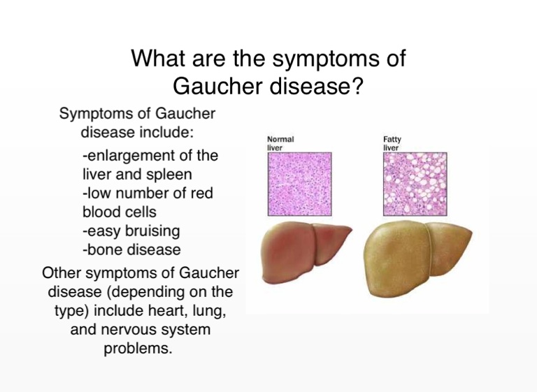 Other symptoms of Gaucher disease (depending on the type) include heart, lung, and nervous system problems.