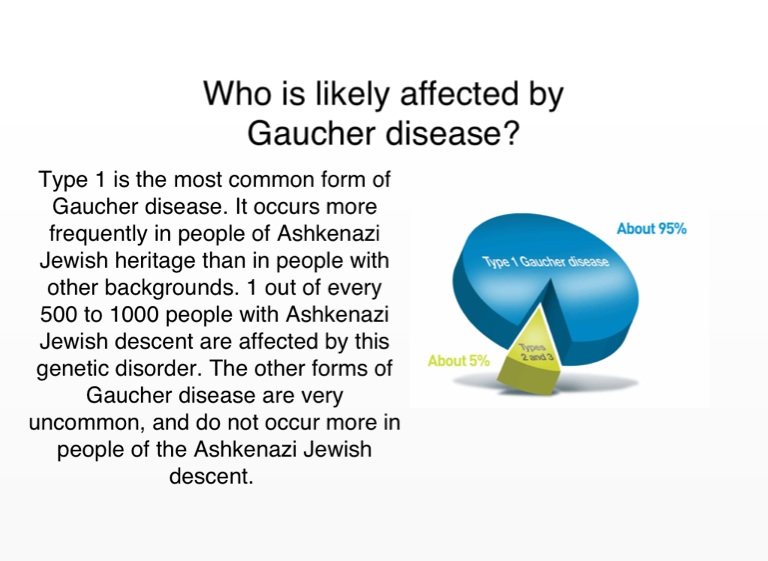 Type 1 is the most common form of Gaucher disease. It occurs more frequently in people of Ashkenazi Jewish heritage than in people with other backgrounds. 1 out of every 500 to 1000 people with Ashkenazi Jewish descent are affected by this genetic disorder. The other forms of Gaucher disease are very uncommon, and do not occur more in people of the Ashkenazi Jewish descent.