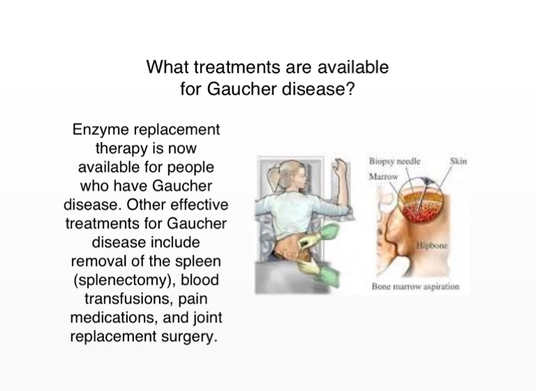 Enzyme replacement therapy is now available for people who have Gaucher disease. Other effective treatments for Gaucher disease include removal of the spleen (splenectomy), blood transfusions, pain medications, and joint replacement surgery.