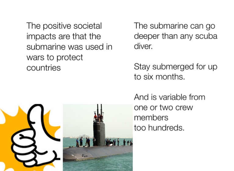 The positive societal impacts are that the submarine was used in wars to protect countries