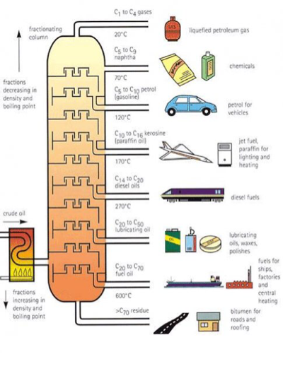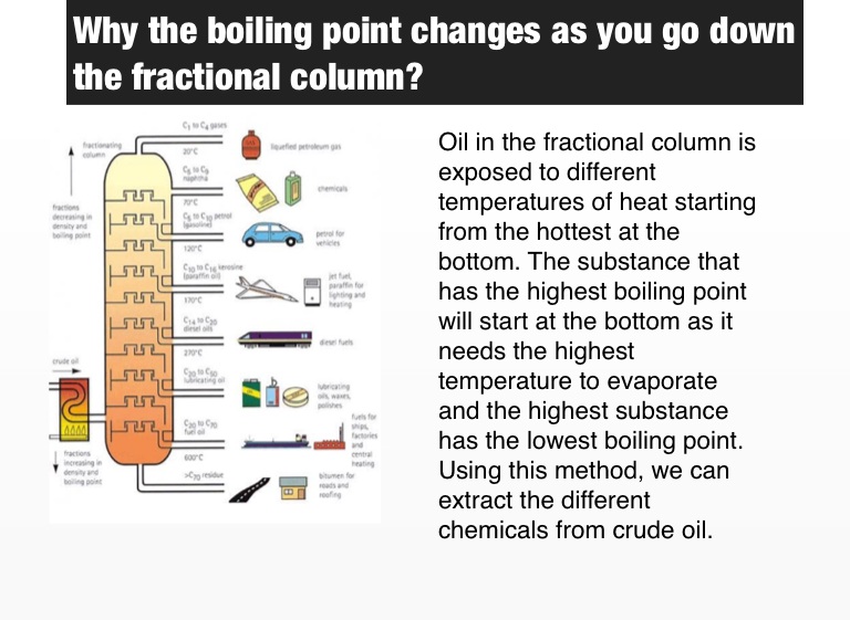 Oil in the fractional column is exposed to different temperatures of heat starting from the hottest at the bottom. The substance that has the highest boiling point will start at the bottom as it needs the highest temperature to evaporate and the highest substance has the lowest boiling point. Using this method, we can extract the different chemicals from crude oil.