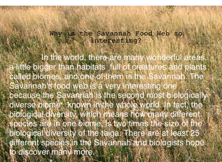 In the world, there are many wonderful areas, a little bigger than habitats full of creatures and plants called biomes, and one of them is the Savannah. The Savannah's food web is a very interesting one because the Savannah is the second most biologically diverse biome known in the whole world. In fact, the biological diversity, which means how many different species are in one biome, is two times the size of the biological diversity of the taiga. There are at least 25 different species in the Savannah and biologists hope to discover many more.