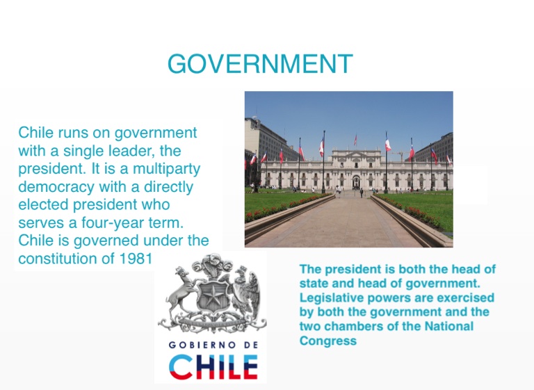 Chile runs on government with a single leader, the president. It is a multiparty democracy with a directly elected president who serves a four-year term. Chile is governed under the constitution of 1981