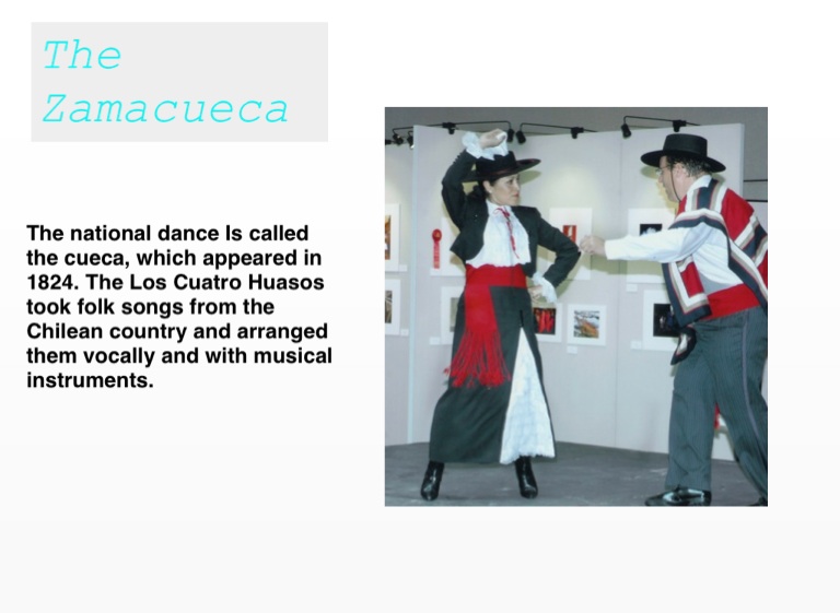 The national dance Is called the cueca, which appeared in 1824. The Los Cuatro Huasos took folk songs from the Chilean country and arranged them vocally and with musical instruments.