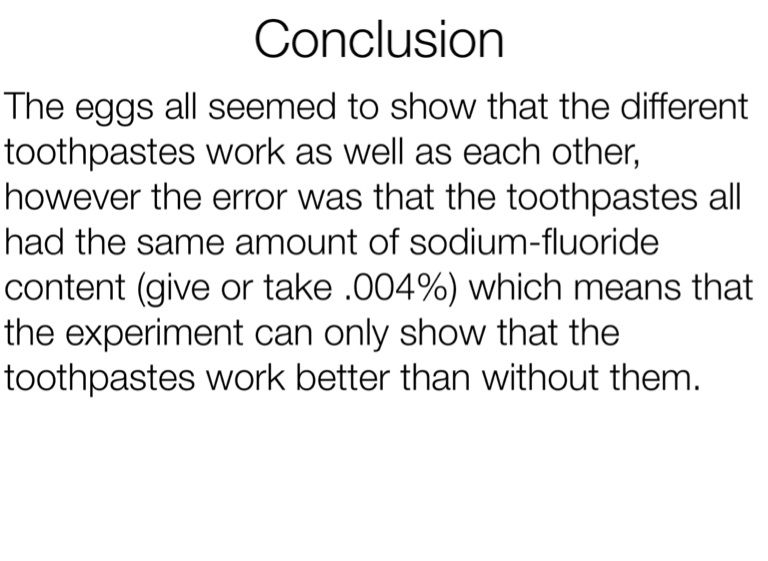 The eggs all seemed to show that the different toothpastes work as well as each other, however the error was that the toothpastes all had the same amount of sodium-fluoride content (give or take .004%) which means that the experiment can only show that the toothpastes work better than without them.