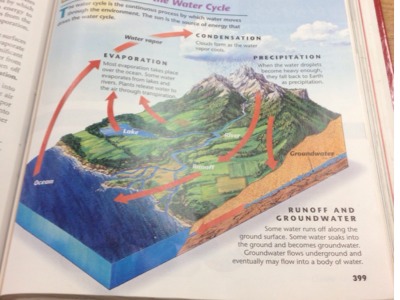 In the water cycle, water moves from bodies of water, land, and living things on earths surface to the atmosphere and back to the earths surface.