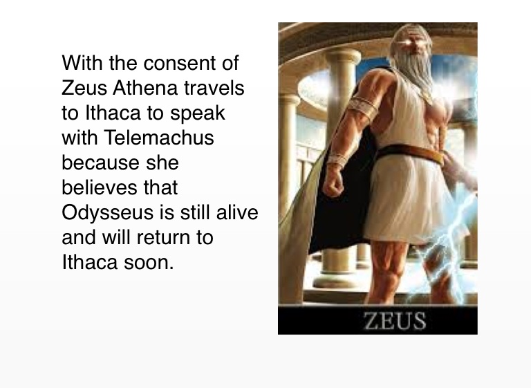 With the consent of Zeus Athena travels to Ithaca to speak with Telemachus because she believes that Odysseus is still alive and will return to Ithaca soon.
