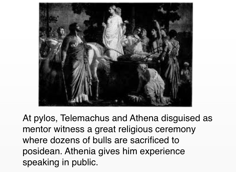 At pylos, Telemachus and Athena disguised as mentor witness a great religious ceremony where dozens of bulls are sacrificed to posidean. Athenia gives him experience speaking in public.