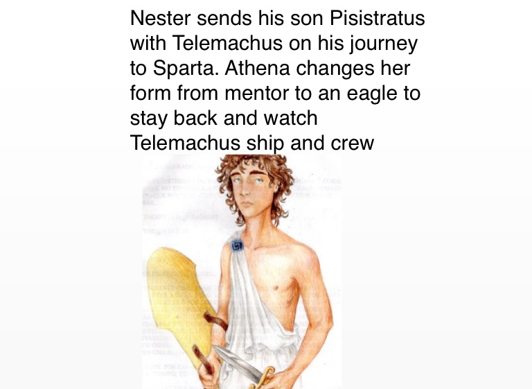 Nester sends his son Pisistratus with Telemachus on his journey to Sparta. Athena changes her form from mentor to an eagle to stay back and watch Telemachus ship and crew