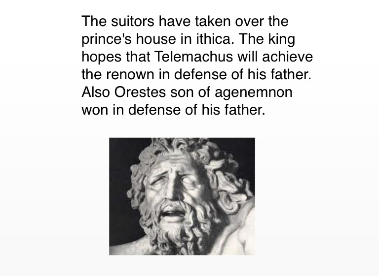 The suitors have taken over the prince's house in ithica. The king hopes that Telemachus will achieve the renown in defense of his father. Also Orestes son of agenemnon won in defense of his father.